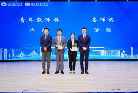 首先颁发的是青年教师奖与名师奖。公共卫生学院教师肖莎、生命科学与医学技术学院教师邬强登台领奖。副校长丁治国与总监高飞共同为两位教师颁奖并合影。
