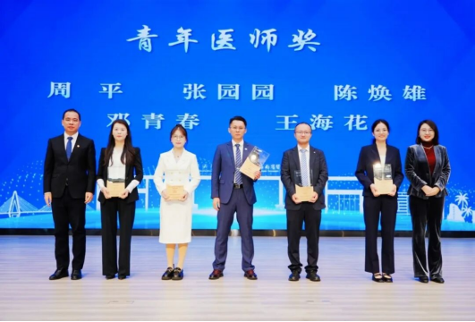 随后进行的是青年医师奖的颁发。第一附属医院周平、张园园,第二附属医院陈焕雄、邓青春、王海花等五位医师依次接受荣誉。副校长黄斌文与总经理张琳作为颁奖嘉宾,为五位青年医师颁授证书与奖杯。