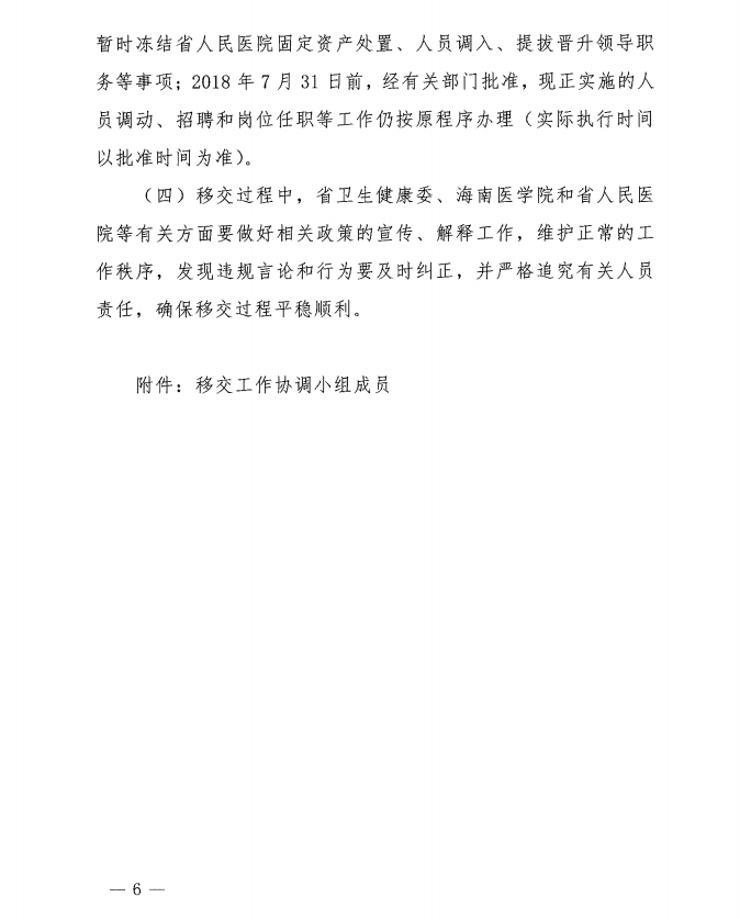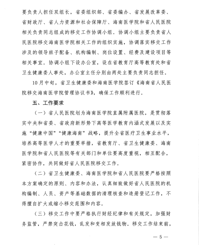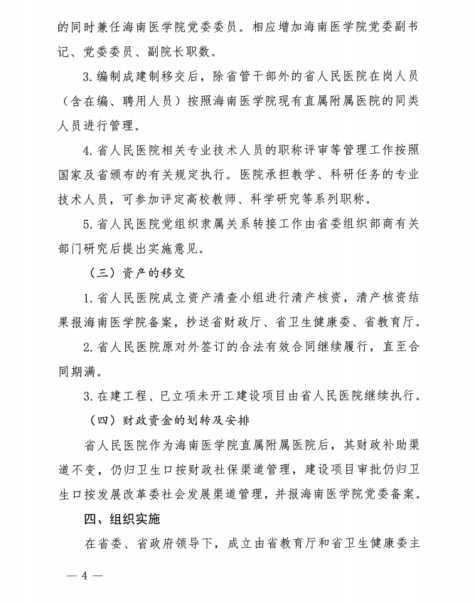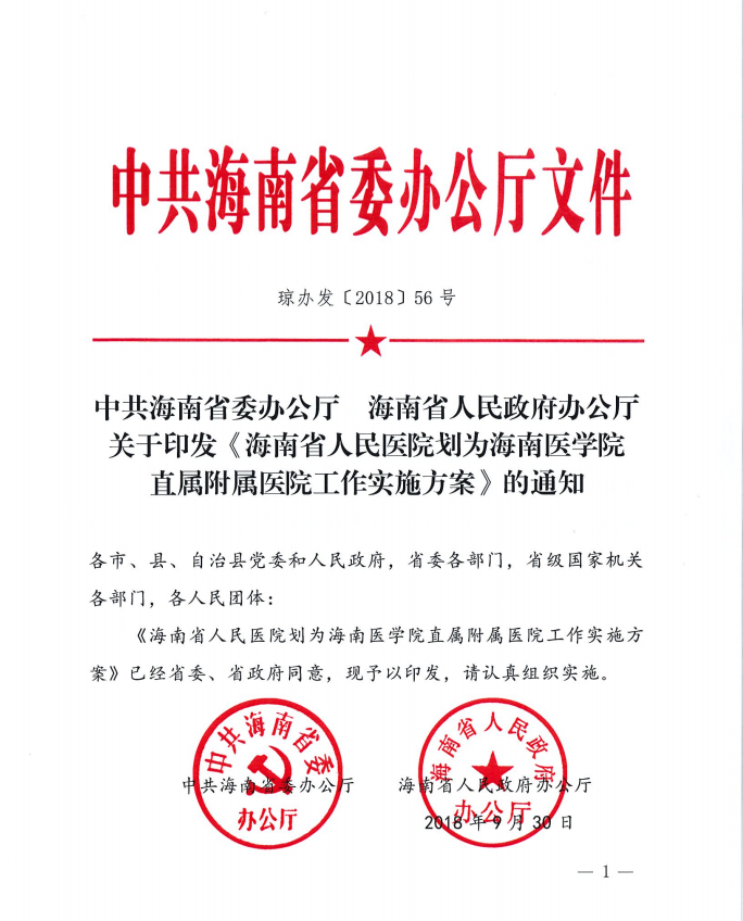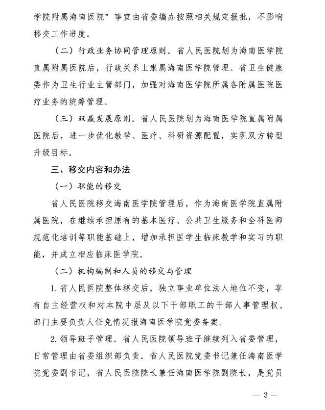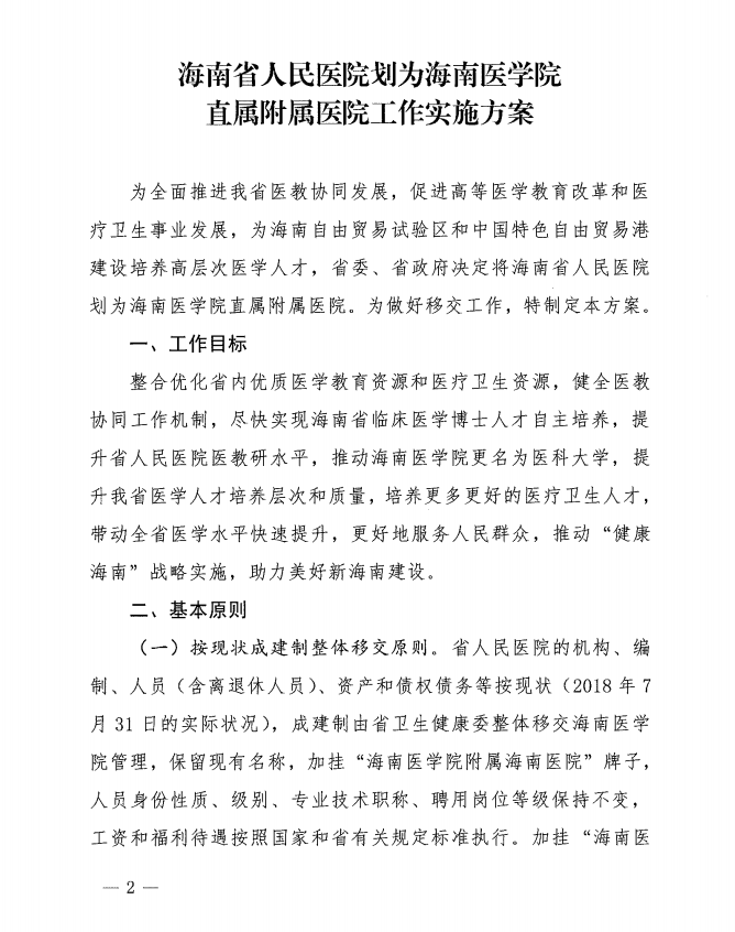 关于印发《海南省人民医院划为海南医学院直属附属医院工作实施方案》的通知