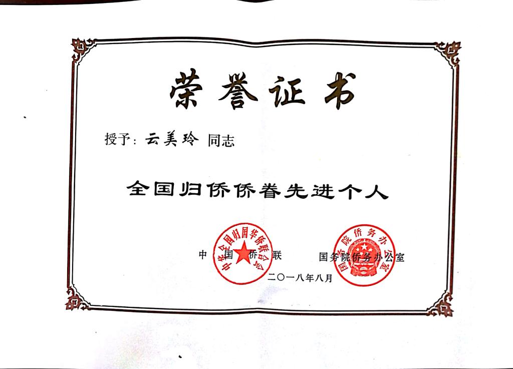 热烈祝贺云美玲同志荣获“全国归侨眷先进个人”称号