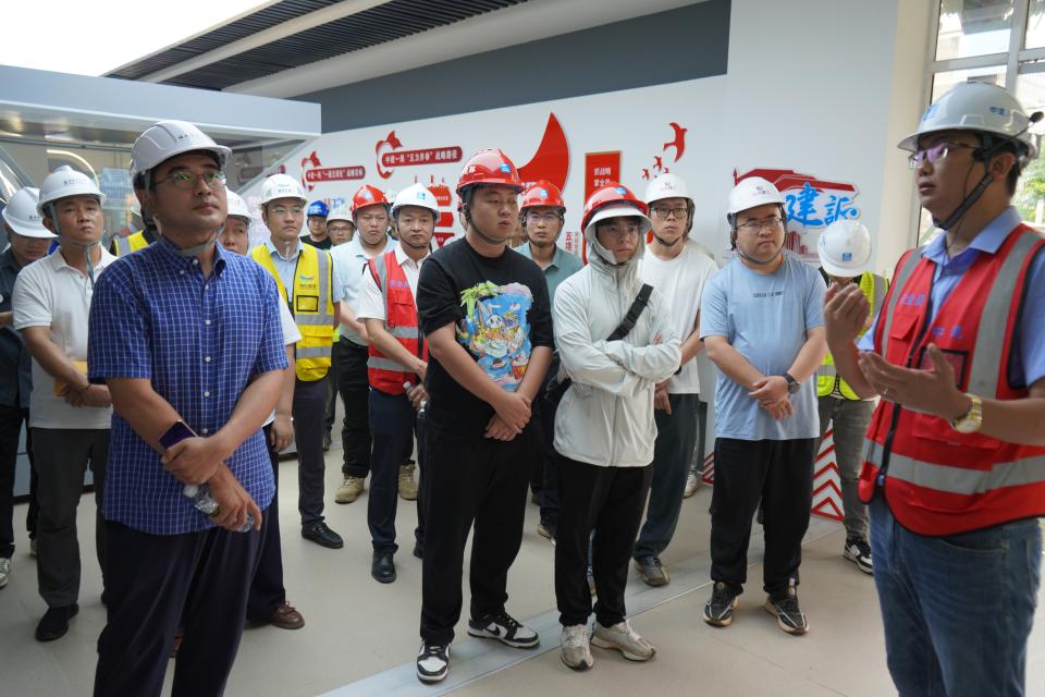 第二站抵达的海南中心项目是海南在建第一高楼,设计高度428米,承载着打造自贸港城市新地标的使命。参访团队近距离了解项目在超高层建筑垂直运输、混凝土泵送、防风抗震等领域的核心技术突破。中建三局项目团队重点介绍了其自主研发的“轻量化顶模集成平台”和“智能监测系统”。通过集成传感器实时监测风速、结构应力等数据,并结合云端分析预警,项目实现了施工安全与效率的双重保障。