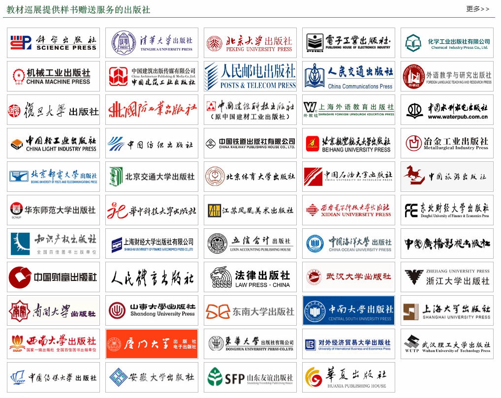 本活动依托于“教材巡展网上行”(www.jcxzwsx.com)服务平台,“教材巡展网上行”平台参展的出版社包括:科学出版社、清华大学出版社、北京大学出版社、电子工业出版社、化学工业出版社、机械工业出版社、人民邮电出版社、上海外语教育出版社、外语教学与研究出版社等160多家优秀教材出版单位,其中赠送教材样书的出版社54家,可赠送教材样书品种20万余种。线上教材巡展活动将重点展示各家出版社近三年出版的各类获奖教材、规划教材和精品教材。