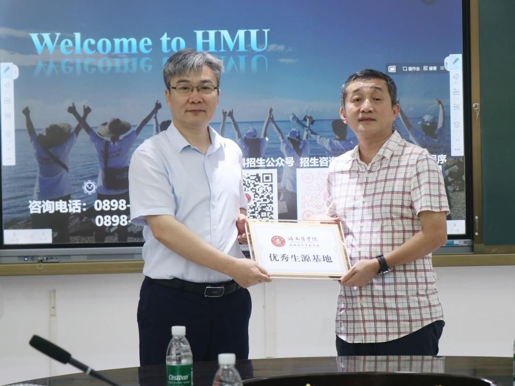 最后,刘笑然院长代表海南医学院授予三亚市第一中学“优秀生源基地”的牌子,双方领导均表示今后要进一步加强联系,为优秀学生提供更好的进一步学习教学环境和学校。