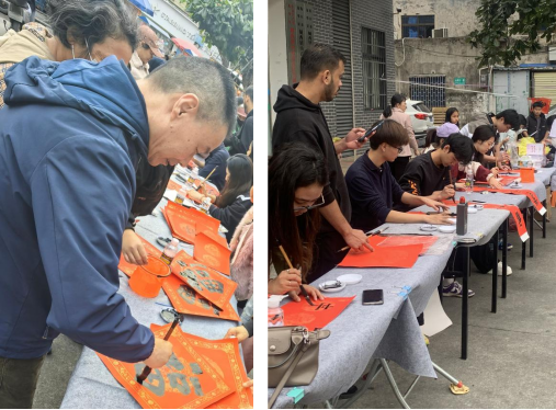 活动吸引了社区居民的热情围观和参与,现场人流络绎不绝。马克思主义学院徐海波老师带领着翰墨书画协会和临床医学院的同学们为大家写春联和“福”字。受到活动现场气氛的感染,一些居民也亲自动手写“福”字,为自己及家人送祝福,并与taptap点点师生交流书写心得,进一步感受书法魅力。
