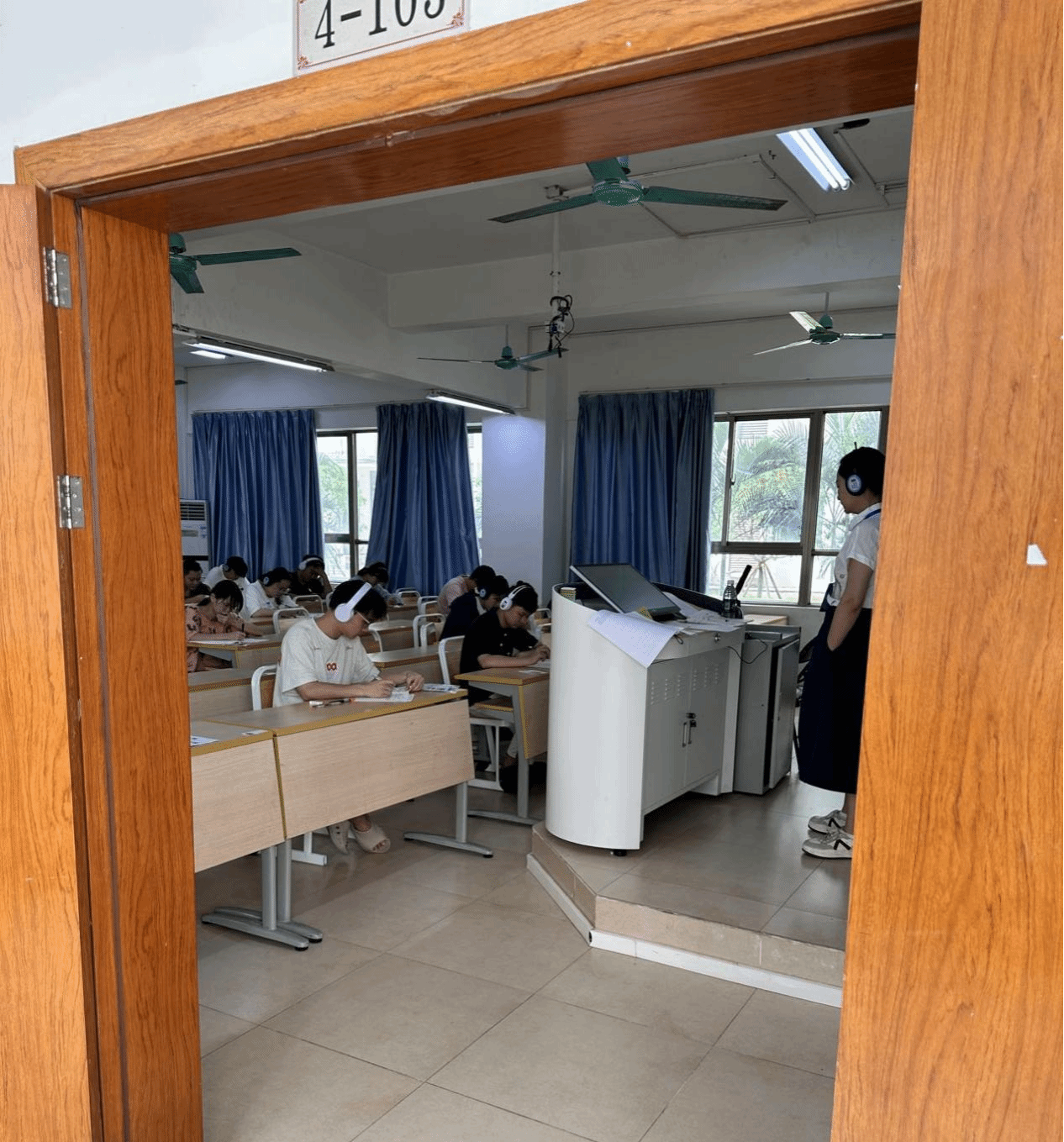 6月11日中央气象台发布台风“蝴蝶”蓝色预警后,教务处提前与省考试局沟通,申请试卷提前入库,后勤处提前完成考场清洁、桌椅检修,同步加固考场门窗、疏通排水管道;外语部和现代教育中心对听力播放系统、监控系统进行24小时压力测试,确保极端天气下设备稳定运行。