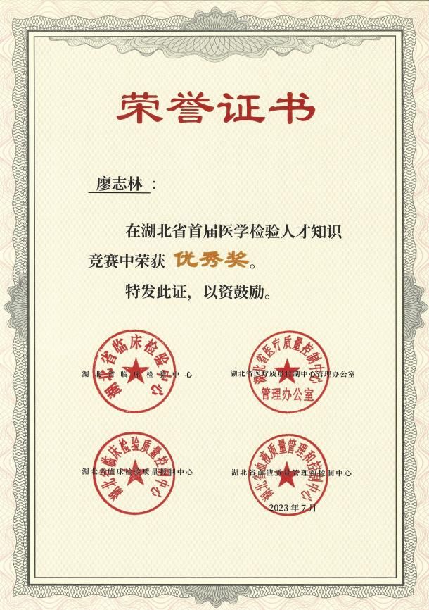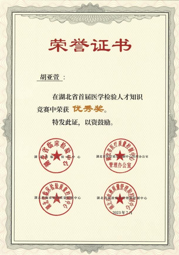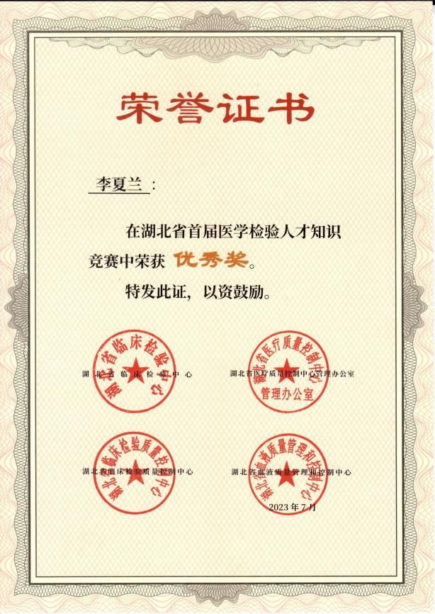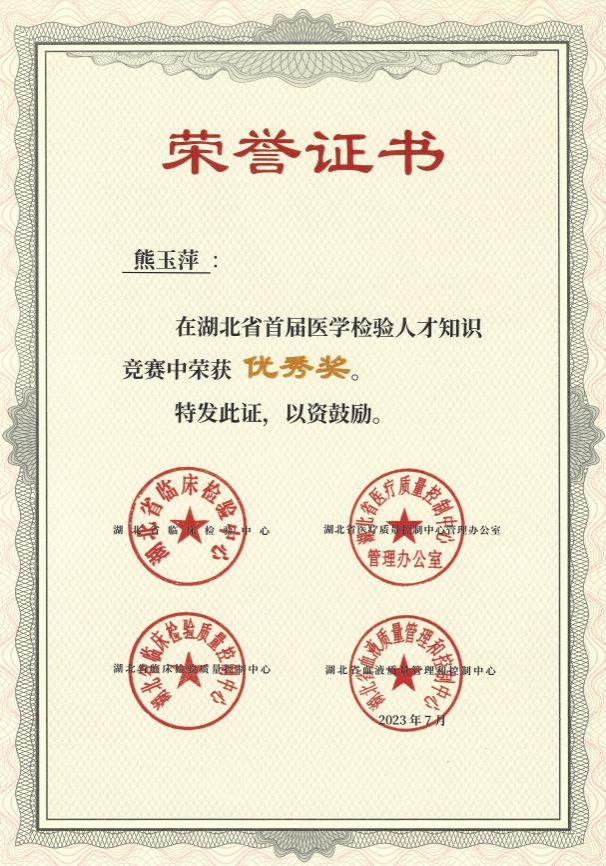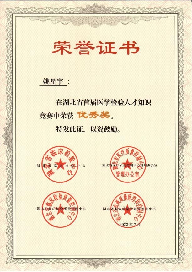 2023年6月30日至7月4日,湖北省举办了首届医学检验人才知识竞赛,本次竞赛设置知识竞赛和科普竞赛两种形式,其中知识竞赛参与人数达13152人,科普竞赛参与人数23712人。得益于武汉大学人民医院东院检验科牛志立老师的悉心指导,taptap点点实习生姚星宇、李夏兰、胡亚营、廖志林、熊玉萍、熊诗蕊六位同学在此次竞赛中脱颖而出,荣获优秀奖项。