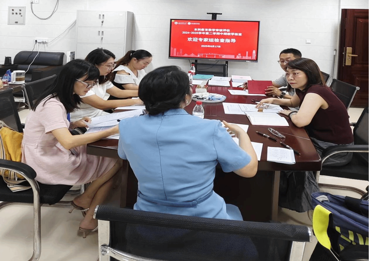 本次检查由校级检查专家组琚新梅教授任组长,李秀兰副处长任副组长,阳晓丽、田雨参与,秘书黄奕弟。检查围绕审核评估工作进展、支撑材料规范性、自查报告三大核心,通过“汇报-审查-访谈-反馈”四步流程,全面检验职能部门评估筹备情况。