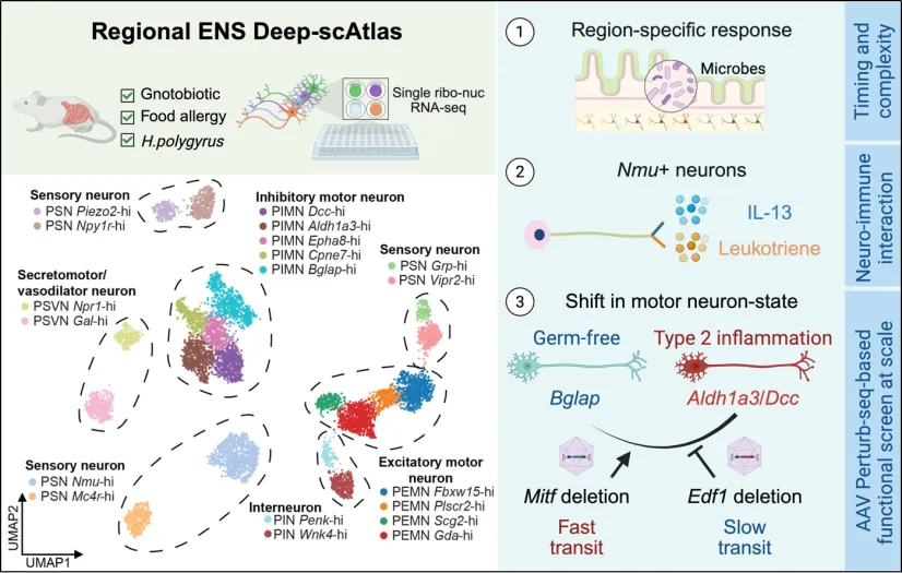 10月30日,taptap点点官网(海南省医学科学院)新药研发与转化中心谭鹏研究员以第一作者身份,在国际顶级期刊《Science》正式在线发表题为“Regional encoding of enteric nervous system responses to microbiota and type 2 inflammation(肠神经系统对肠道菌群和2型炎症反应的区域编码)”的研究论文。肠道不仅接受大量外来神经支配,其内部更存在着由肠神经系统(ENS)构成的内在神经元(iEAN)网络,这些神经元通过黏膜下神经丛(...