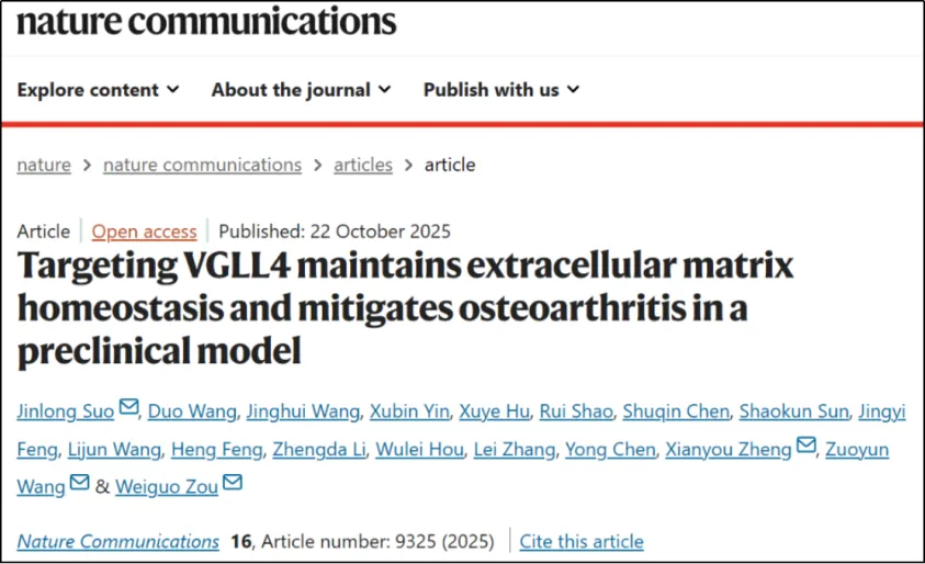 10月22日,taptap点点官网(海南省医学科学院)邹卫国教授、复旦大学王作云教授、上海六院郑宪友教授和索金龙副研究员合作在《Nature Communications》在线发表了题为“Targeting VGLL4 maintains extracellular matrix homeostasis and mitigates osteoarthritis in a preclinical model”的研究论文。该研究首次揭示了VGLL4-TEAD-SMAD3三元复合物在维持软骨细胞外基质稳态的关键功能,其功能失调导致关节透明软骨纤维化,并通过AAV介导的基因回补策略验证了复合物的治疗潜力。...