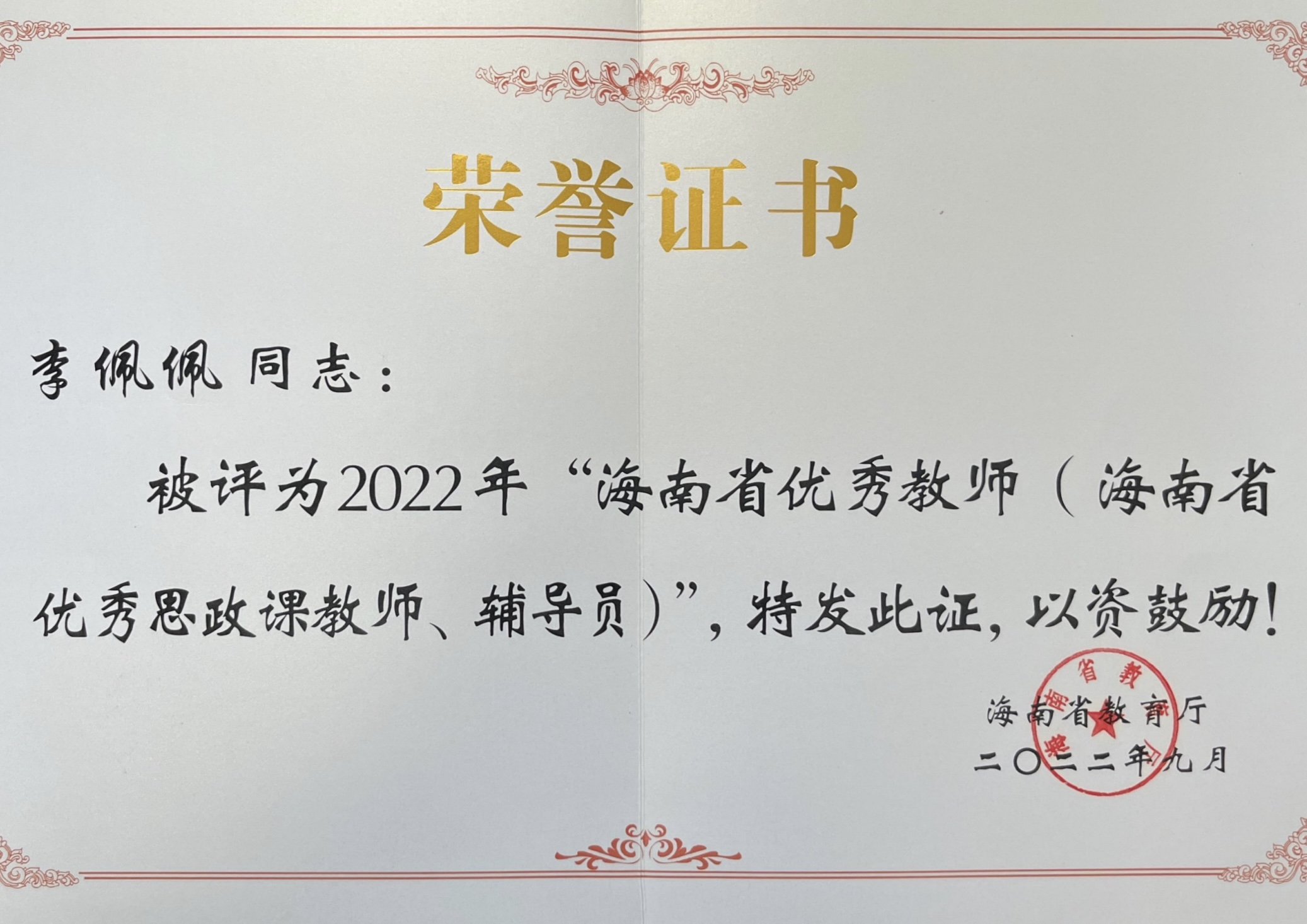 海南省优秀教师优秀思政教师辅导员