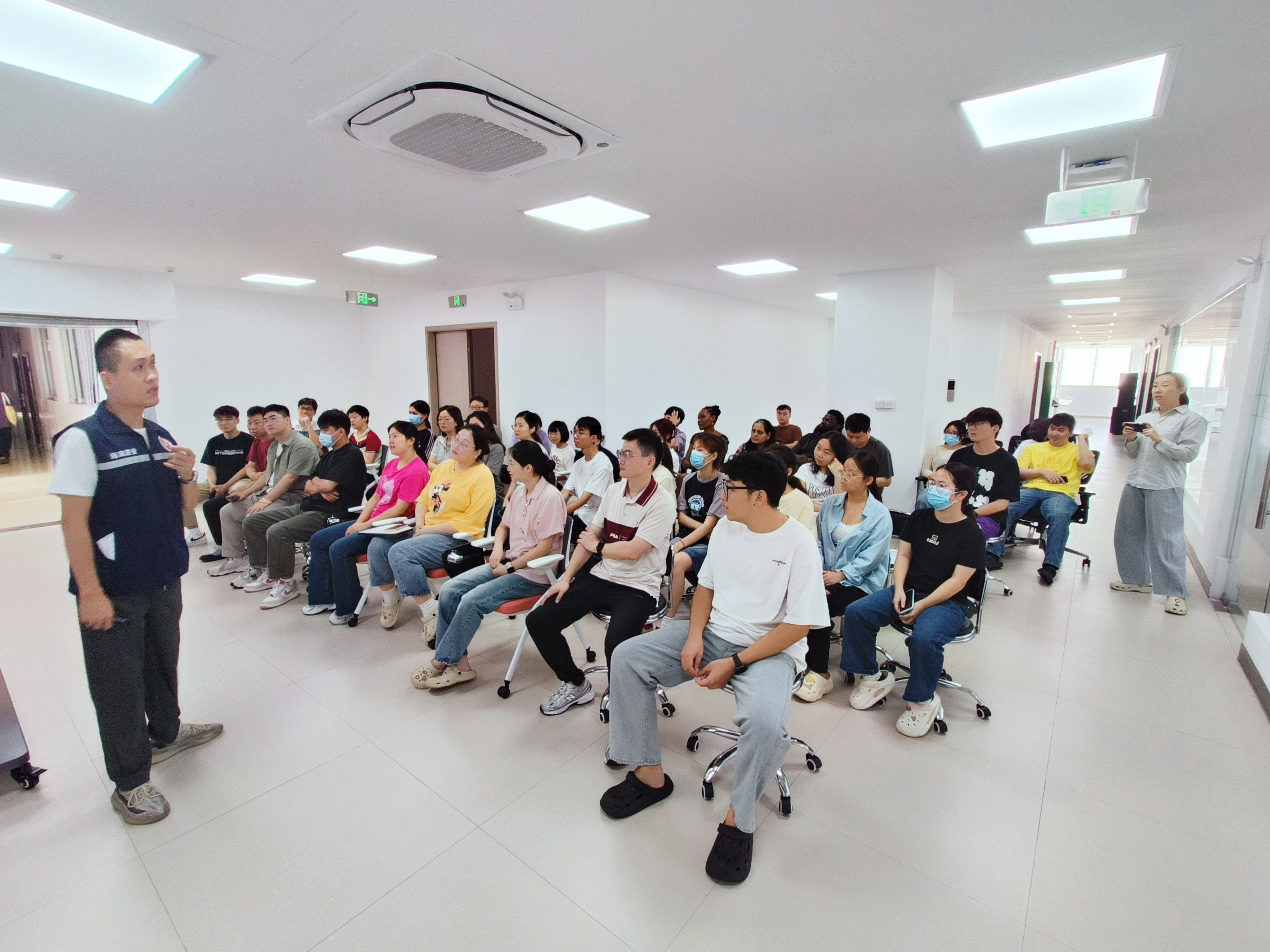 培训中,讲师还重点讲解了火灾发生时的应急逃生技巧,包括如何迅速判断火灾形势、选择正确的逃生路线、低姿弯腰并用湿毛巾捂住口鼻避免吸入有毒烟雾等。同时,针对实验室内存在的消防安全隐患进行了现场排查,并指导实验室负责人后续该怎样进行整改。