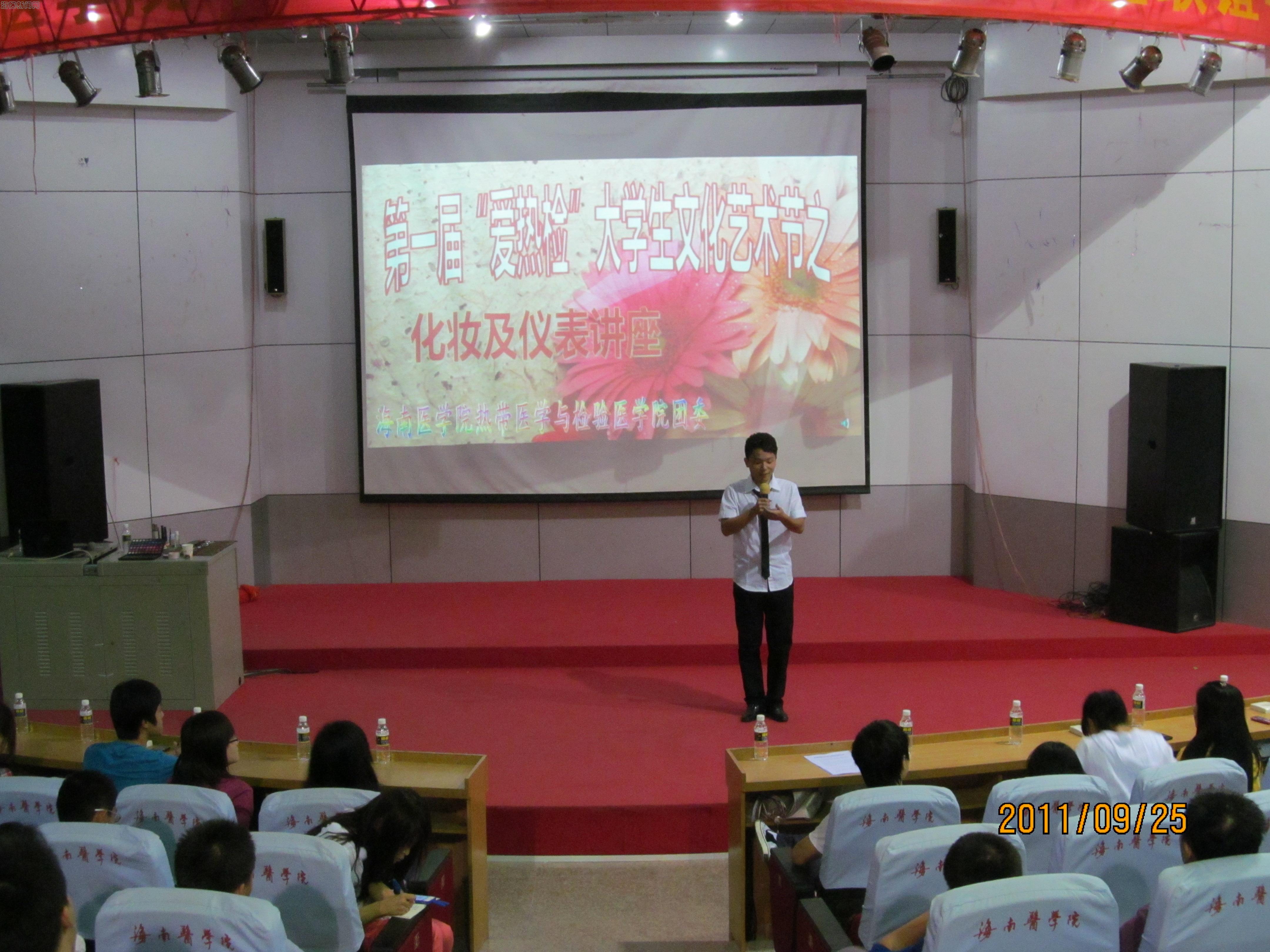 为了提高同学们对化妆及礼仪相关知识的了解,走好成功人生每一步,热带医学与检验医学院于2011年9月25日在多功能报告厅成功举办第一届“爱热检”大学生文化艺术节之化妆及仪表讲座。学院党总支刘启昌书记、傅琼瑶副书记、团委书记陈锦龙参加本次活动。
