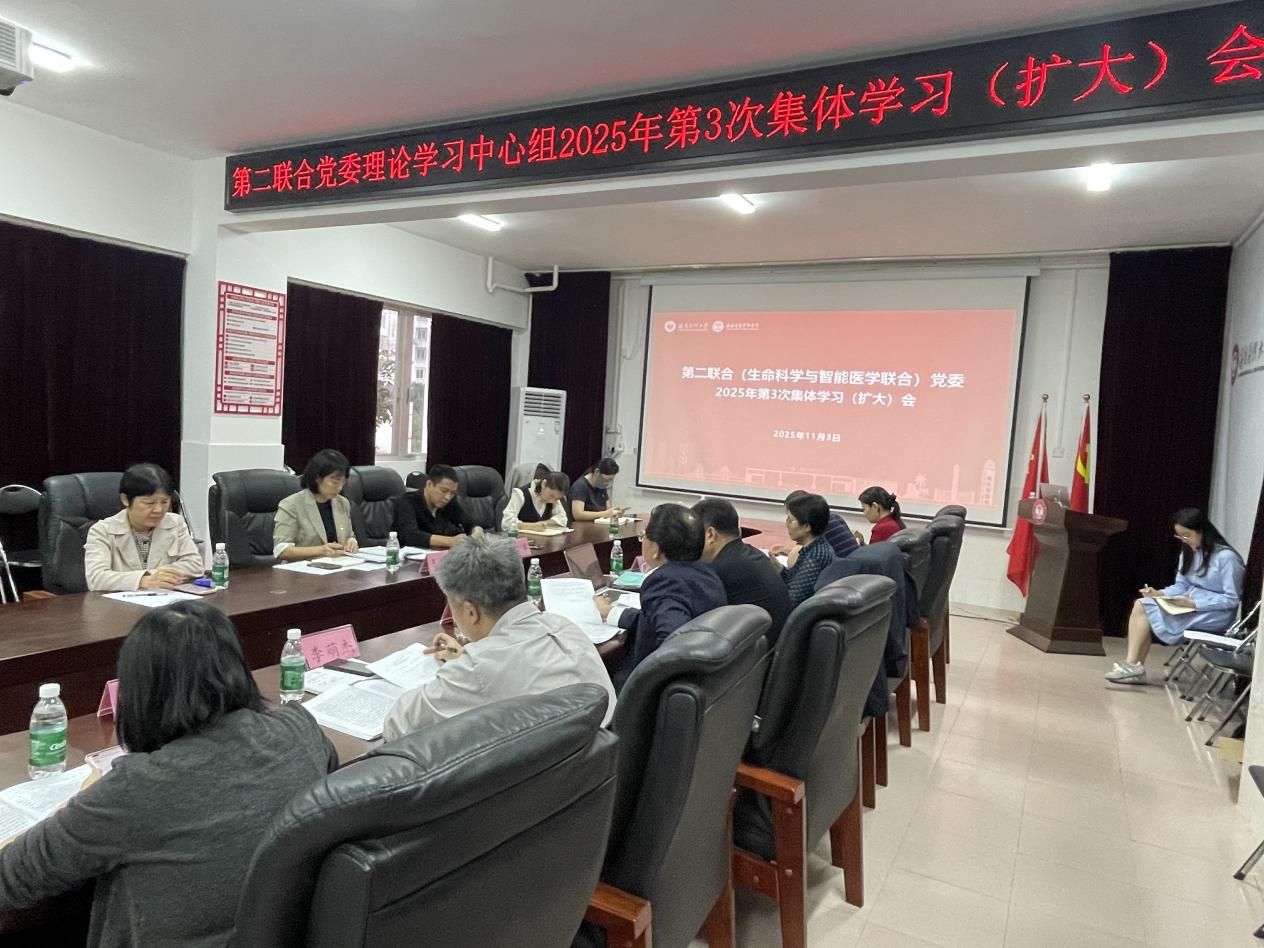 11月3日下午,第二联合(生命科学与智能医学联合)党委理论学习中心组在润深楼402会议室召开2025年第3次理论学习中心组学习(扩大)会,专题学习《中共中央关于制定国民经济和社会发展第十五个五年规划的建议》等重要文件精神。第二联合党委理论学习中心组成员、全体党支部书记参会,学校巡听旁听专员王晗书记、缪军书记应邀出席。会议由第二联合党委书记李春报主持并作总结讲话。