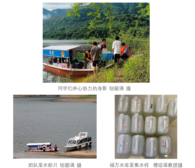 骄阳似火,烈日炎炎,福万水库师生们的欢声笑语如缕缕清风驱赶了暑气,彰显着青春的朝气与斗志。豆大的汗珠是他们对科研的热爱和执着;渐行渐远的船身承载着的是他们毫不动摇的理想信念;或许是饮水之源,使团队与水结缘,雨水淅淅沥沥伴随着一整天的工作,让本就不易的采水任务更加艰难,可从未懈怠的身影和一桶接一桶续满的水样则是他们“检以求真,验以证实”最好的诠释。