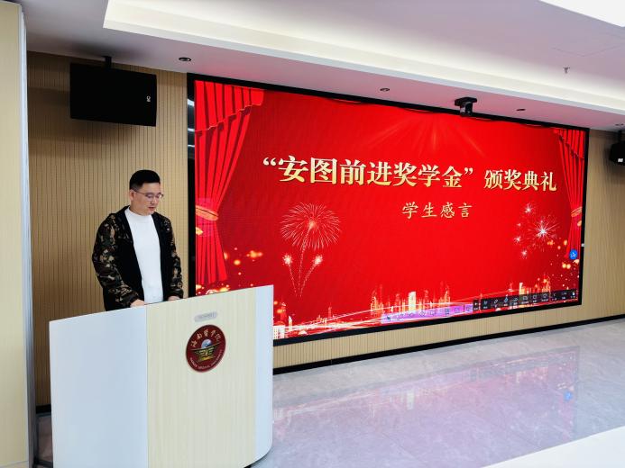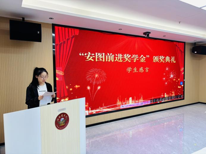 获奖学生代表在发表感言中,深情分享了自己在学业道路上的不懈努力与成长收获,感恩学院和公司提供的良好平台和“安图前进奖学金”的激励,立志将继续拼搏,以精湛医术回报社会。