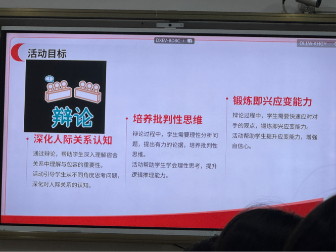 围绕“宿舍关系中理解更重要还是包容更重要”的辩题,正反方展开激烈辩论。一方强调“理解是沟通的基础”,另一方主张“包容是维持关系的润滑剂”。同学们快速应变、理性思辨,最终在“无法反驳对方观点”的规则下,双方达成共识:理解与包容缺一不可,需在具体问题中灵活平衡。