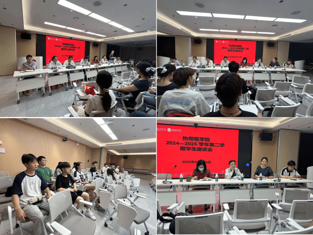 为进一步提升教学质量,全面了解2024-2025学年第二学期的教学运行情况,根据学校教学督导工作的统一部署,热带医学院于2025年5月19日与5月21日分别召开了学生座谈会和教师座谈会,深入开展中期教学督导检查工作。此次座谈由学院教学督导组和教研办组织,相关年级学生代表、专业教秘、各教研室教师代表参加。此外还邀请了校级督导郑文芝教授指导,会议氛围热烈、交流充分。