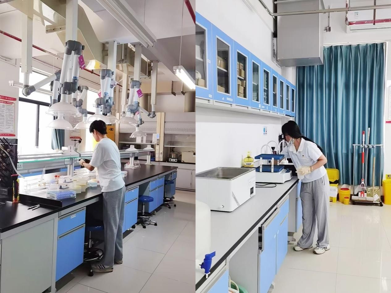 随后,师生们分组对实验室展开全面清洁。重点对生物安全柜、培养箱、精密仪器等设备进行深度消毒,仔细清理可能残留样本的实验台面与仪器缝隙。试剂、样本进行规范分类存放,确保每一个环节都符合生物安全标准。大家默契配合,认真细致地完成每一项清洁任务,用实际行动守护实验室的洁净环境。