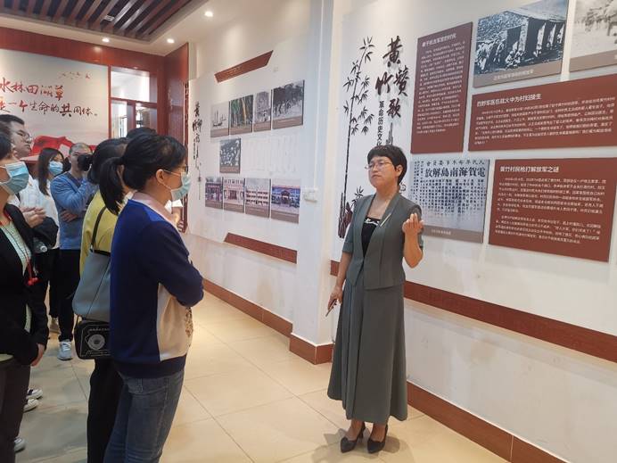 全体党员首先来到黄竹村党群服务中心,参观了黄竹村党支部展厅。常彩红老师声情并茂地为全体党员介绍了黄竹村村委会、党支部的发展历史、黄竹村的革命历史文化及长寿文化。