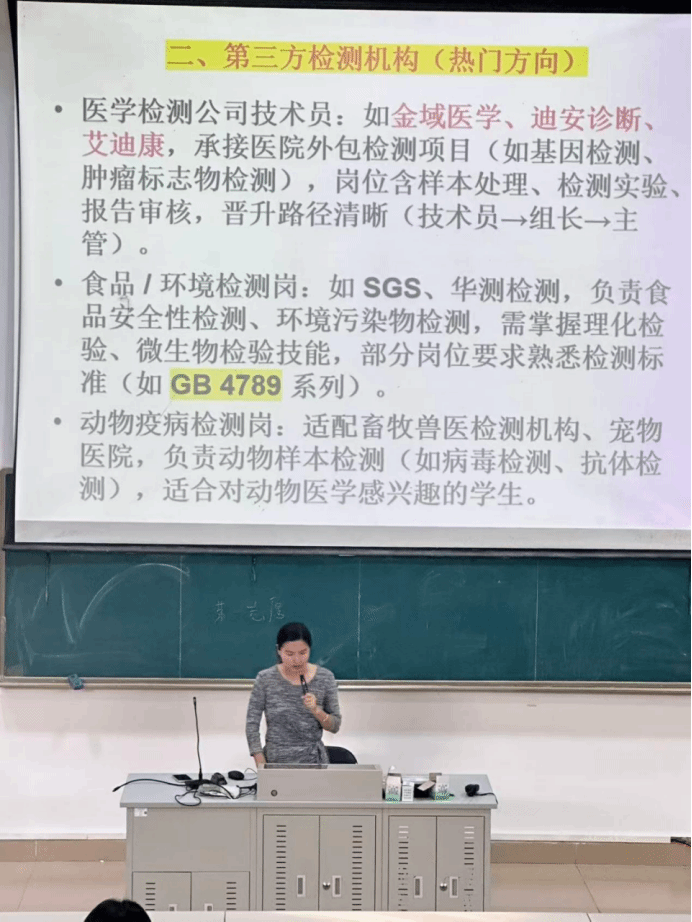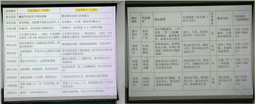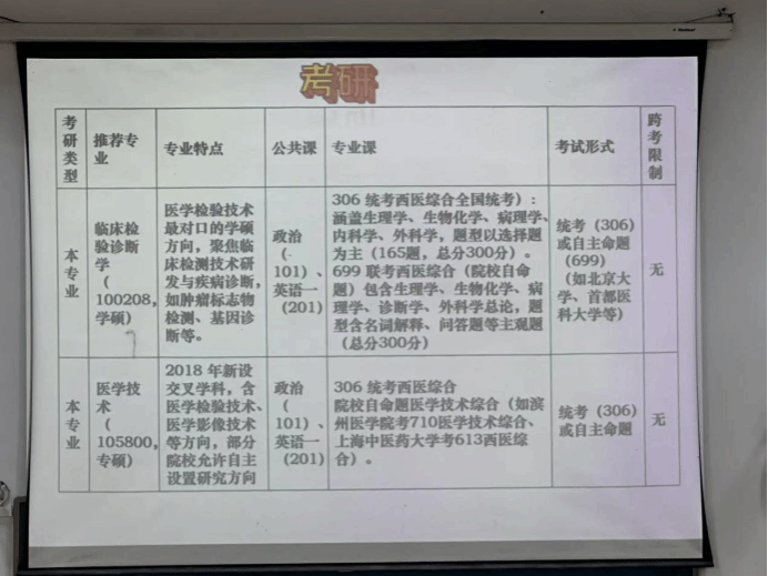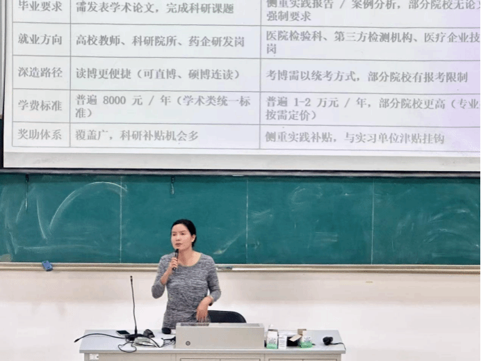 同时,她还解析了本专业考研的具体方向:临床检验诊断学(学硕)聚焦检测技术研发与疾病诊断,医学技术(专硕)涵盖检验、影像等交叉领域,且跨考无限制,为学生拓宽了深造思路。