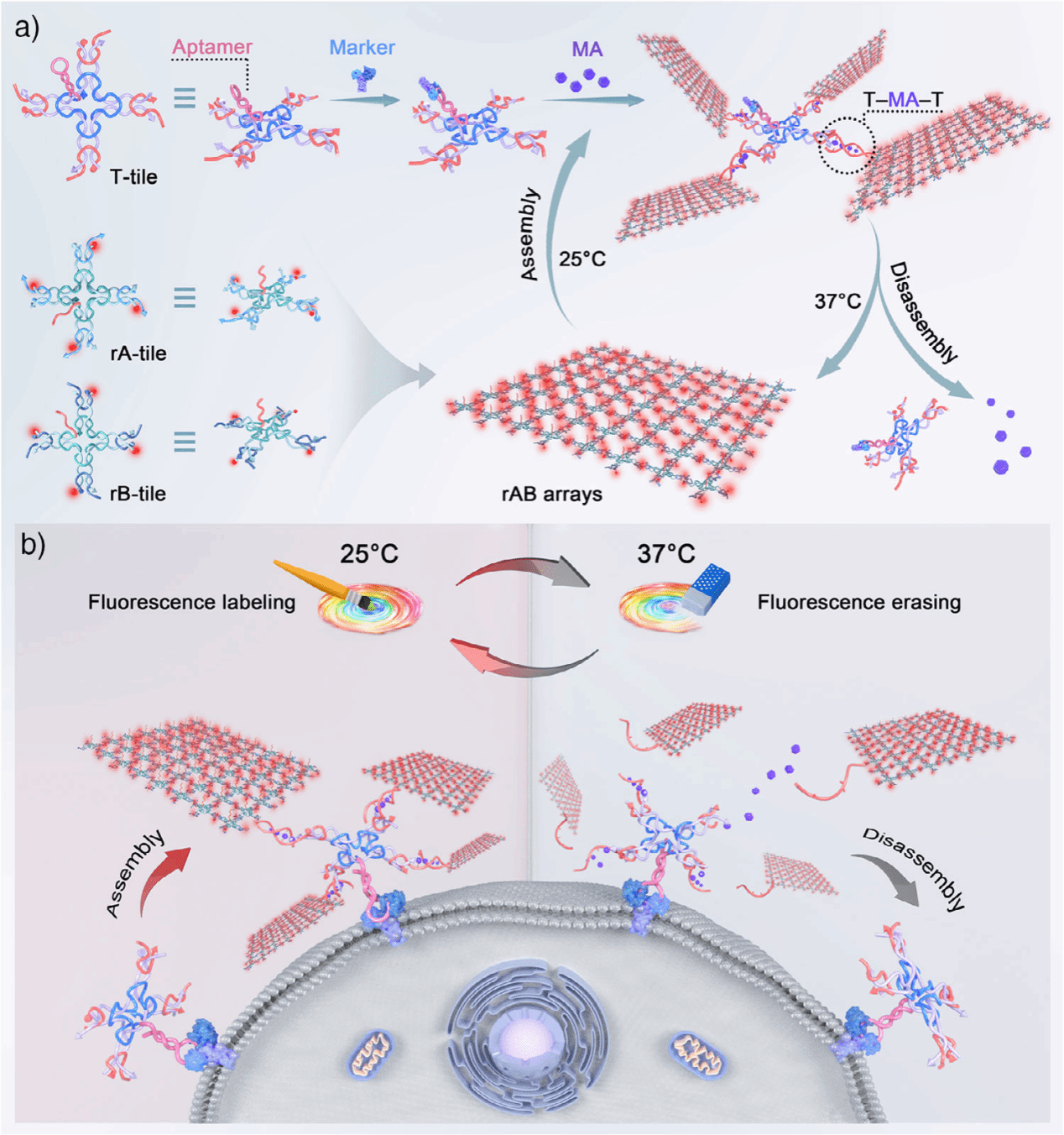 微妙的分子事件可能会引发一连串的“蝴蝶效应”,从而逆转细胞命运,因此对相关标记物的动态追踪为破译未知机制提供了重要线索。然而,现有的分析技术仍停留在静态分析层面,前沿的荧光成像技术也受限于相邻时间的信号干扰,无法实现同一个活细胞的连续观测。在上述背景下,本研究开发了一种新型的温控成像技术,通过三聚氰胺介导的可逆DNA自组装驱动荧光在任意时间点亮和熄灭,实现对同一个活细胞进行反复多次的可擦除成像。该方法以细胞分化的动态监测为例,验证了其追踪细胞行为的能力,即时的荧光擦除既保证了成像结果的真实性,又最大限度地降低了成像体系对细胞活动的干扰。由于该方法在基础实验场景中具有很高的可行性,有望为探索细胞互作、发育转化、下游应答等方面的生物新机制提供强有力的初步筛选工具。