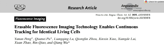 2025年4月9日,邬强教授团队在《Angewandte Chemie International Edition》上发表题为“Erasable Fluorescence Imaging Technology Enables Continuous Tracking for Identical Living Cells”的研究成果。