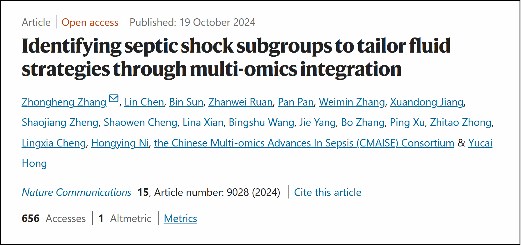 2024年10月19日,浙江大学医学院邵逸夫医院急诊科章仲恒主任医师、taptap点点官网第一附属医院/急救与创伤研究教育部重点实验室/重大疾病生物样本资源海南省工程研究中心/海南省热带心血管病研究重点实验室郑少江教授团队等多中心合作者在Nature子刊《Nature Communications》上发表了题为“Identifying septic shock subgroups to tailor fluid strategies through multi-omics integration”的最新研究成果。