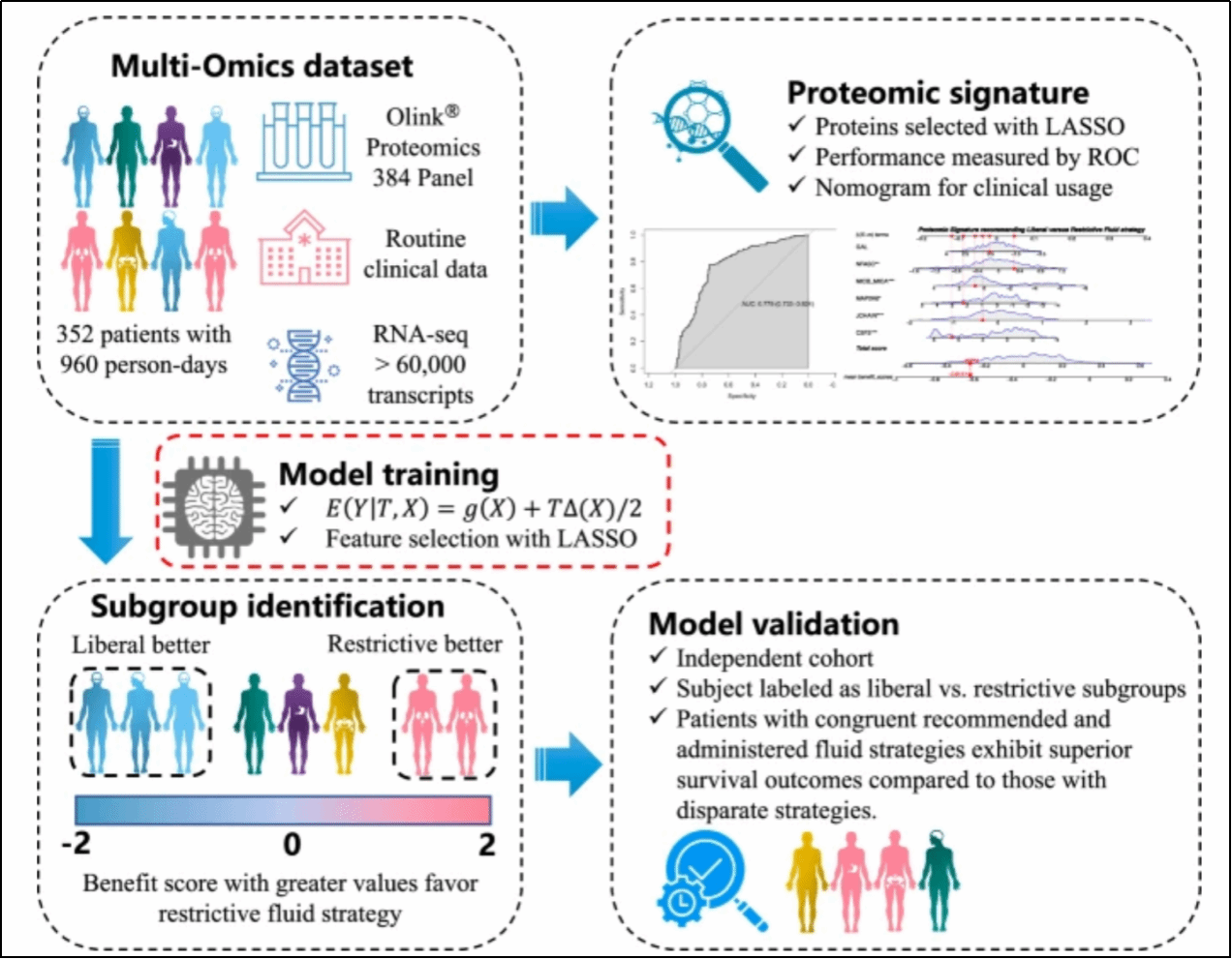 缺乏个性化治疗液体管理仍然是脓毒症休克治疗的一个关键挑战。本研究旨在开发一种基于转录组学的统计模型,以识别对液体策略反应各异的脓毒症休克患者亚组。该研究涵盖了 494 名脓毒症休克患者。益处评分来自转录组空间,值越高表示限制性液体策略的益处越大。遵守推荐策略的风险比为 0.82(95% 置信区间:0.64-0.92)。当应用于 16% 的基线医院死亡率时,遵守推荐的液体策略可能会将该比率降低至 13%。本研究开发了一种包含六种蛋白质的蛋白质组学特征来预测益处评分,在对可能受益于限制性策略的患者进行分类时,曲线下面积为 0.802(95% 置信区间:0.752–0.846)。在该项工作中,团队开发了一种蛋白质组学特征、具有潜在指导脓毒症休克患者液体治疗的新策略。