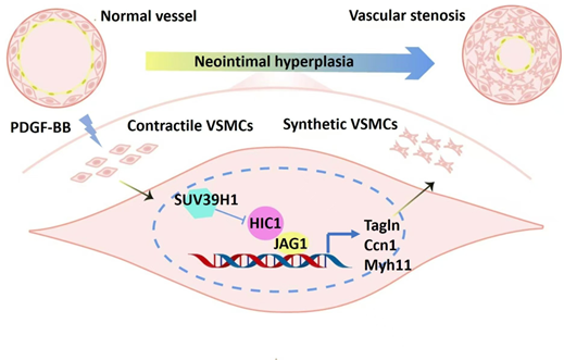 总之,研究者新发现了平滑肌细胞中Suv39h1 在血管损伤时表达上调,并抑制HIC1-Jag1信号通路,从而促进VSMC的迁移和增殖,进而促进血管狭窄。本文新发现Suv39h1是血管损伤的新调节因子,Suv39h1可作为干预再狭窄的新靶点。