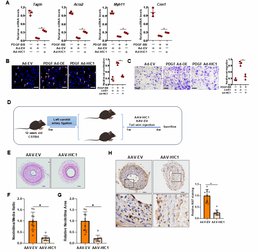 HIC1过表达减轻了PDGF-BB对VSMCs收缩基因表达的抑制,并抑制细胞增殖和迁移。利用AAV9病毒载体尾静脉注射VSMC特异性的HIC1过表达载体,发现HIC1的过表达在体内显著抑制了新生内膜的形成。