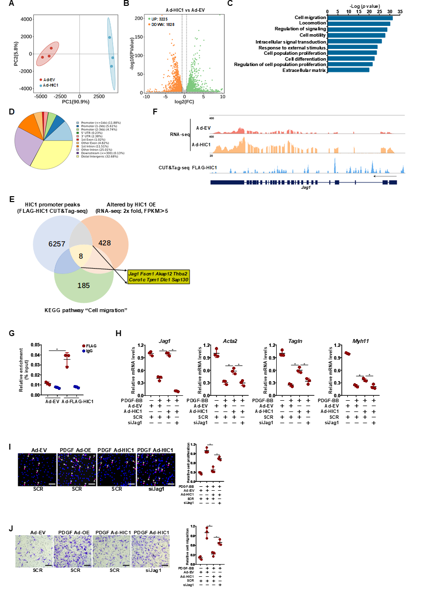 RNA-seq和CUT&Tag实验将潜在的HIC1靶基因范围缩小至8个,其中Jag1基因位列首位。ChIP分析结果证实了HIC1与VSMCs中Jag1基因启动子区域直接结合。在VSMCs中,HIC1的过表达部分逆转了PDGF-BB对收缩基因表达的抑制作用,而Jag1基因的沉默则抵消了这一效应,同时也逆转了HIC1对细胞增殖和迁移的抑制效果。这说明HIC1抑制VSMC迁移和增殖依赖于激活Jag1转录,而Jag1作为Notch配体抑制VSMCs的迁移和增殖。