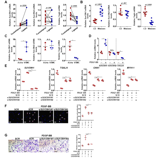 首先,研究者发现C57BL/6小鼠接受颈动脉结扎手术后,损伤侧动脉中Suv39h1表达水平显著上调,在Apoe-/-小鼠喂食西方饮食12周后其主动脉中Suv39h1的表达水平也显著升高,而都伴随收缩标记物SM22a水平降低,但未观察到Suv39h2表达的显著变化。这些结果说明Suv39h1而不是Suv39h2与VSMC收缩特性的降低存在正相关关系。使用siRNA转染人原代主动脉平滑肌细胞并用PDGF-BB处理,发现Suv39h1的沉默部分逆转了PDGF-BB诱导的收缩基因下调,并且显著抑制了VSMCs的细胞增殖和迁移能力。说明Suv39h1促进VSMC向合成型转化。