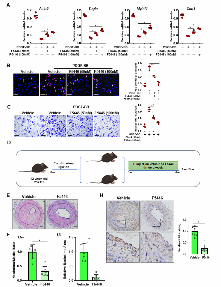 使用Suv39h1小分子抑制剂F5446(H3K9甲基化酶特异性抑制剂)与PDGF-BB共同处理VSMCs后,F5446显著减轻了PDGF-BB对收缩基因表达的抑制作用,并减弱了细胞增殖和迁移能力。C57BL/6小鼠接受颈动脉结扎手术后,与对照组相比,给予F5446显著减轻了小鼠损伤动脉中的内膜增生,且抑制了VSMCs增殖,并保护收缩基因表达。