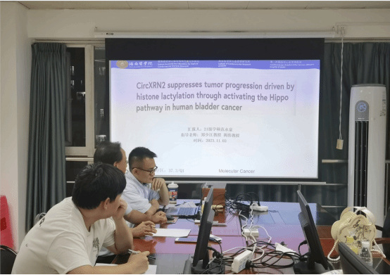 2. 由研究生范永豪进行文献汇报:《CircXRN2 suppresses tumor progression driven byhistone lactylation through activating the Hippopathway in human bladder cancer》,与参会人员汇报了自己近期阅读的文献,主要内容包括研究目的、研究方法、研究结果和结论,以及在阅读过程中的心得体会和感悟。同时,与会人员还就文献中的一些具体问题进行了深入的讨论和交流。