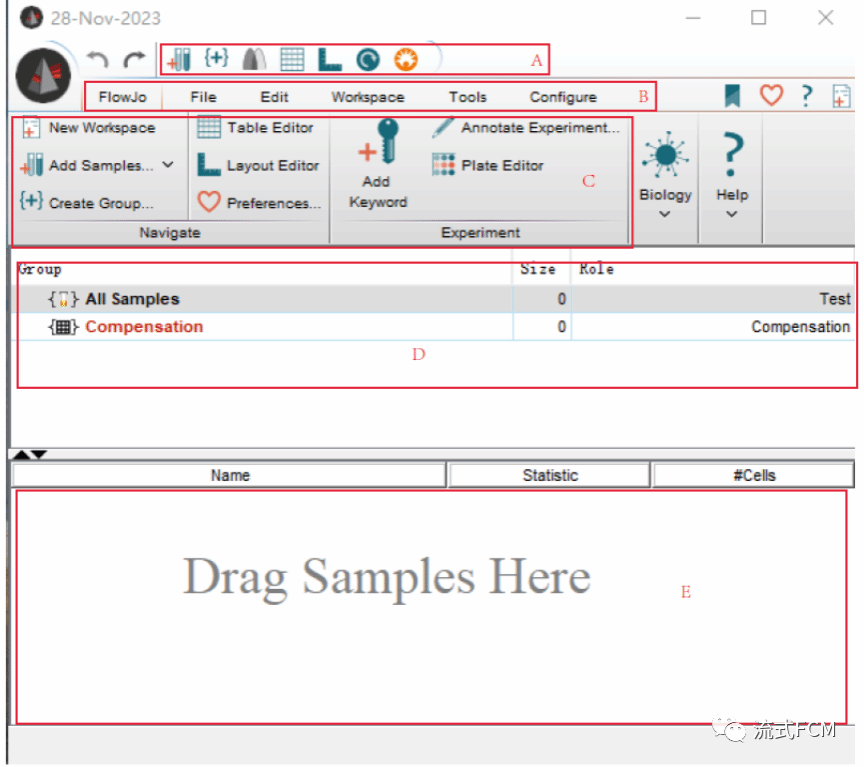 FlowJo_10.8.1的主界面如下图所示,主要分为A至E这五个区域。