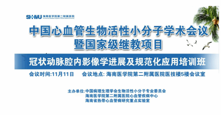 为促进海南省心血管病精准诊疗及科研水平的不断提高,进一步推进海南省级临床医学中心—心血管疾病中心的学科发展,全面提升及加强国内外学科融合氛围,由中国病理生理学会生物活性小分子专业委员会、海南省继续教育医学委员会、海南医学院第二附属医院心血管疾病中心、海南省热带心血管病研究重点实验室联合主办的中国心血管生物活性小分子学术会议暨国家级继教项目-冠状动脉腔内影像学进展及规范化应用培训班11月10-12日在海口市举办。