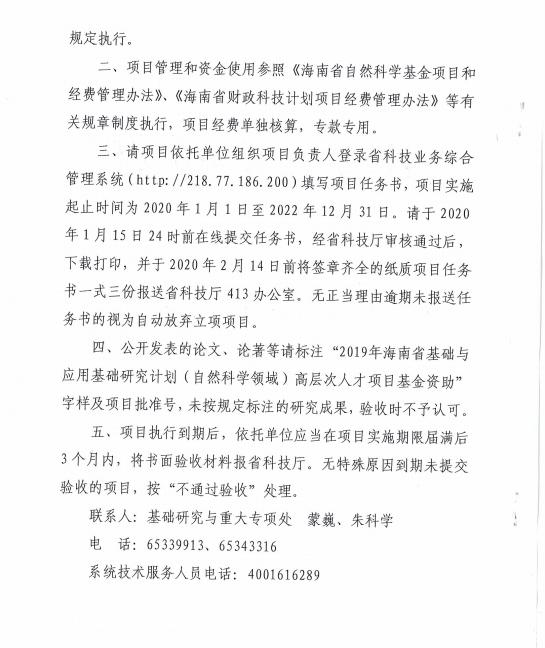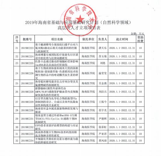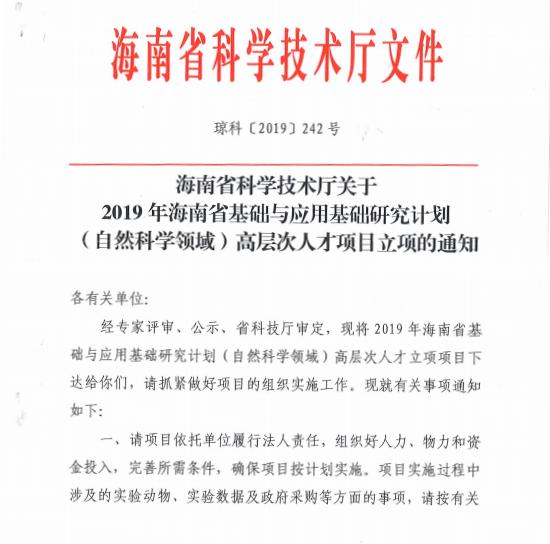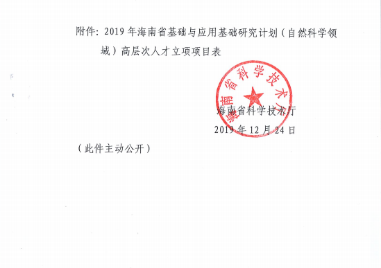 海南省科学技术厅关于2019年海南省基础与应用基础研究计划(自然科学领域)高层次人才项目立项的通知