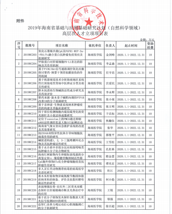 海南省科学技术厅关于2019年海南省基础与应用基础研究计划(自然科学领域)高层次人才项目立项的通知.pdf