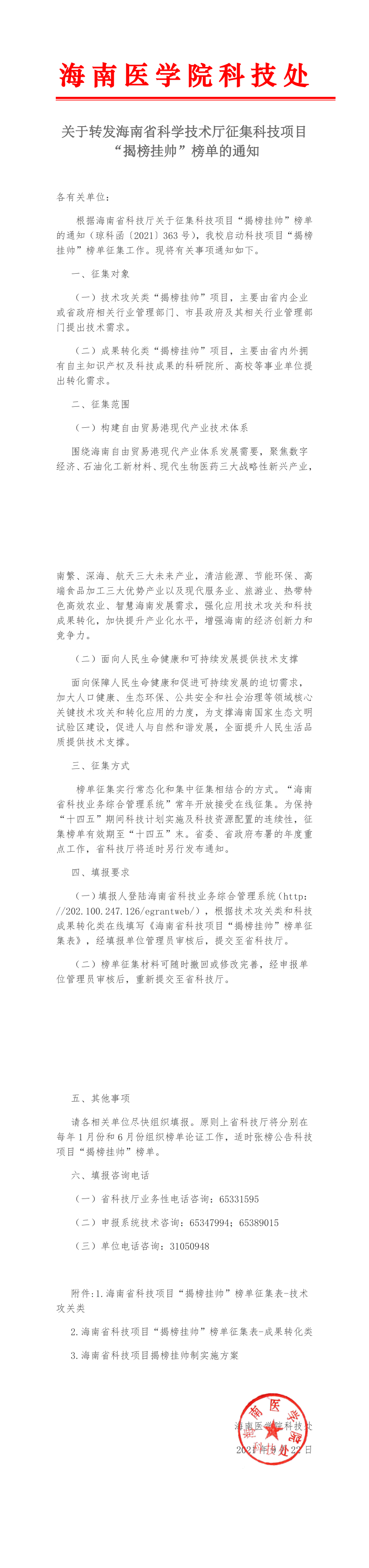 关于转发海南省科学技术厅征集科技项目“揭榜挂帅”榜单的通知
