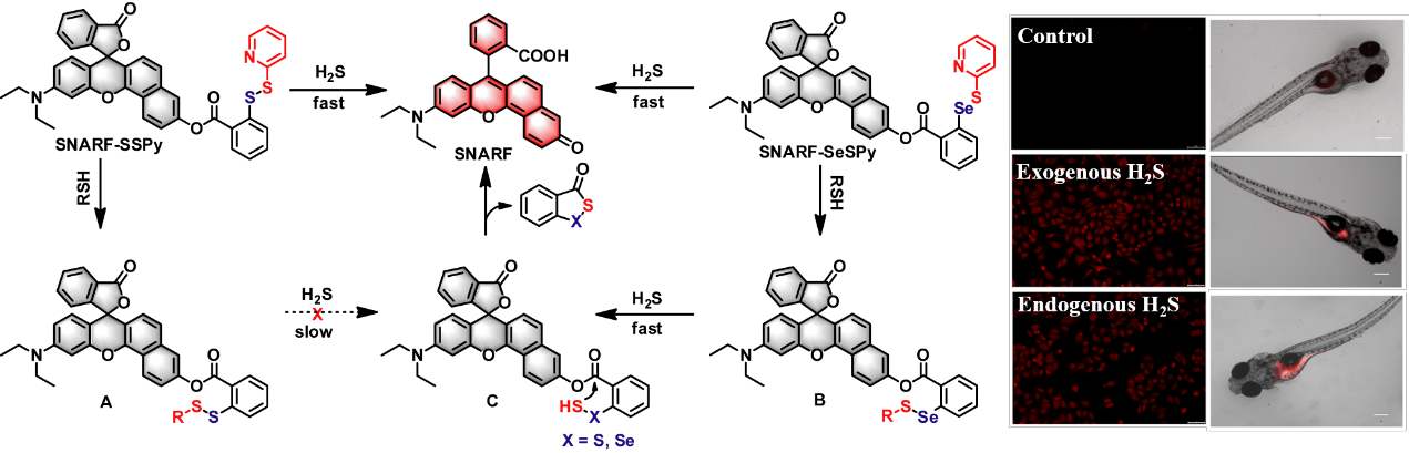 海南医学院功能材料与分子影像团队于法标教授与武汉工程大学孙琦副教授基于硒-硫交换反应联合设计了一种高选择性红光荧光增强型H2S探针,该研究指导教师为我院青年教师刘恒副教授。在该项研究中,我们对比了荧光探针SNARF-SSPy和SNARF-SeSPy对H2S的响应性质。有趣的是,在高浓度其它硫醇共存条件下,SNARF-SeSPy依然能对H2S特异性响应,而SNARF-SSPy在相同测试条件下却无法响应H2S。我们推测SNARF-SeSPy出色的抗干扰性是归因于硒的亲电性比硫强,更易被H2S进攻发生硒-硫交换反应。探针SNARF-SeSPy本身几乎无荧光,但当其与H2S发生亲核取代反应及分子内环化反应之后,其荧光信号恢复,从而实现对H2S的检测。当用580 nm的光激发时,H2S的加入会使探针SNARF-SeSPy在635 nm处的荧光发射出现明显的增强,其颜色变化可被裸眼观察。在其它干扰物种共存时,探针SNARF-SeSPyR也都显示出了优异的选择性。在0- 20 μM的H2S浓度范围内,探针荧光强度与浓度呈良好的线性关系,经计算探针的检测限是34 nM,其灵敏度能满足对体内H2S的检测。细胞毒性、细胞成像和斑马鱼成像实验结果表明:探针SNARF-SeSPy毒性很小,可用于细胞和斑马鱼外源性及内源性的H2S荧光成像,这项工作为生物体内H2S的检测提供了一种新的荧光分子工具,这无论是对与H2S相关的细胞生物学研究还是疾病诊断均有重要意义。