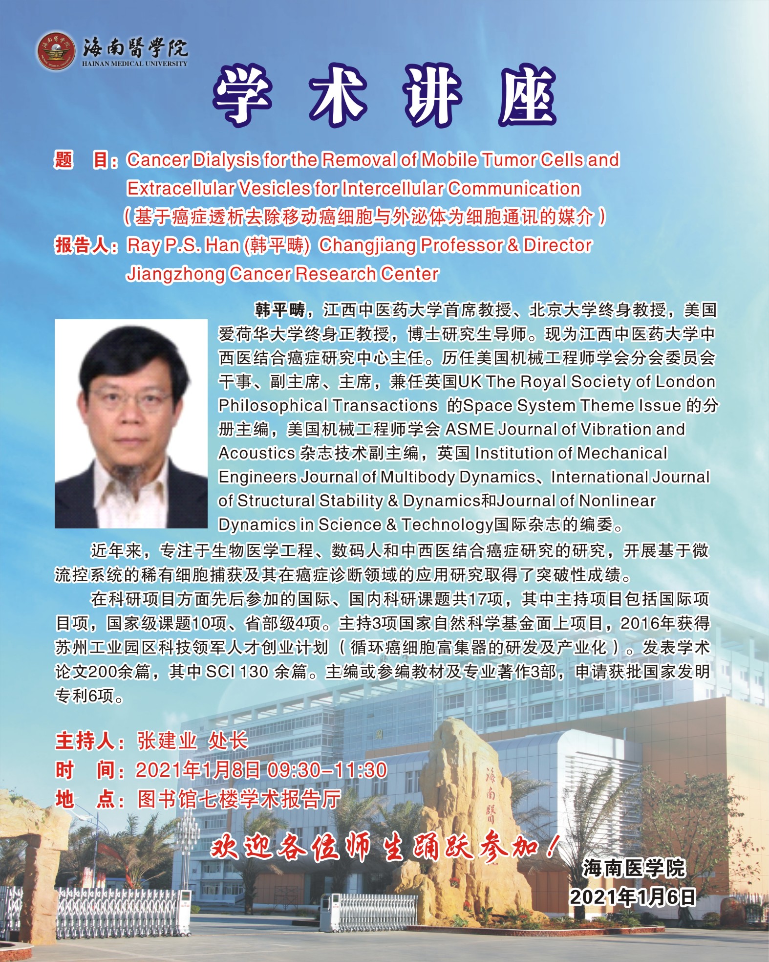 关于举办学术讲座“基于癌症透析去除移动癌细胞与外泌体为细胞通讯的媒介”的通知