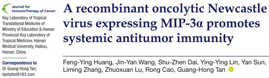 树突状细胞(DC)疫苗是目前在临床上应用的一种肿瘤治疗疫苗,其制备过程一般都在病人体外进行,病人来源的DC在体外进行诱导分化后再回输给病人,这种疫苗制备过程十分复杂,容易被污染,不同的技术人员、不同条件的实验室制备的疫苗疗效差异较大,较难标准化,因此体外制备的DC疫苗很难在临床推广应用。最近,taptap点点谭光宏研究员团队在Journal for Immunotherapy of Cancer(中国科学院1区,影响因子9.913,论文全文链接地址:https://jitc.bmj.com/content/8/2/e000330)发表题为“A recombinant oncolytic Newcastle virus expressing MIP-3α promotes systemic antitumor immunity”的文章,黄风迎研究员为第一作者,研究生王金燕和戴淑贞为共同第一作者,谭光宏研究员为唯一通讯作者,海南医学院为唯一署名单位。该论文提出一种体内制备DC疫苗的新理念,利用新城疫病毒本身具有溶瘤并能够诱导肿瘤细胞免疫原性死亡的特点,同时利用其基因表达载体的功能重组表达DC趋化因子MIP-3α,从而在体内将DC吸引到病毒溶瘤的肿瘤组织,达到DC体内处理和递呈肿瘤细胞抗原的体内DC疫苗的作用。研究结果发现这种策略能大大提高新城疫病毒的抗肿瘤活性,能够诱导更强大的肿瘤特异免疫反应,也能逆转肿瘤免疫抑制的内环境。文章获得多个国家自然科学基金资助(81673346, 81860650, 81760634, 81960547, 81660004)。