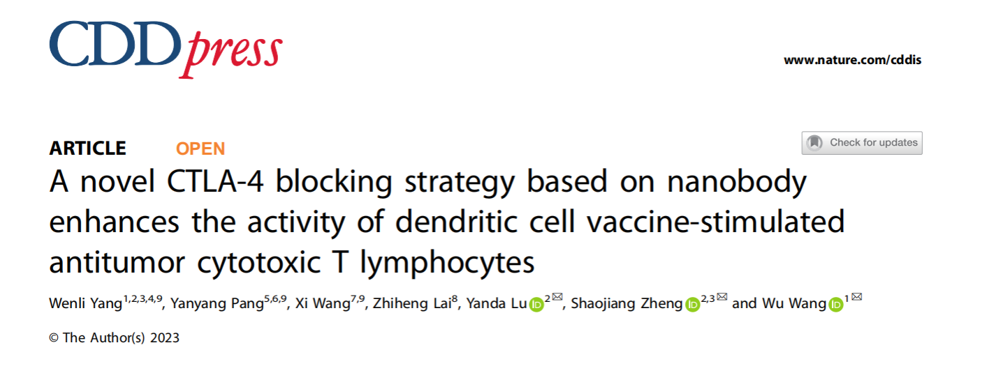 近日,taptap点点科学实验中心王武副研究员课题组与海南医学院肿瘤研究所郑少江教授、卢彦达教授共同在国际知名学术期刊《Cell Death & Disease》(中国科学院一区top IF=9)上发表题为“A novel CTLA-4 blocking strategy based on nanobody enhances the activity of dendritic cell vaccine-stimulated antitumor cytotoxic T lymphocytes”的重要论文。该研究报道了一种基于高特异性抗CTLA-4纳米抗体(Nb)的肿瘤免疫治疗新策略,可高效激活人体CD8+ T淋巴细胞,阻断CTLA-4/B7免疫检查点从而促进T细胞在肿瘤局部的增殖、杀伤以及存活能力。王武副研究员、郑少江教授和卢彦达教授为本文共同通讯作者,遵义医科大学杨文利博士为本文第一作者,论文第一单位为海南医学院科学实验中心。该研究得到多项国家/海南省自然科学基金和海南省院士创新平台专项科研经费支持,以及广西医科大学纳米抗体研究中心技术支持。