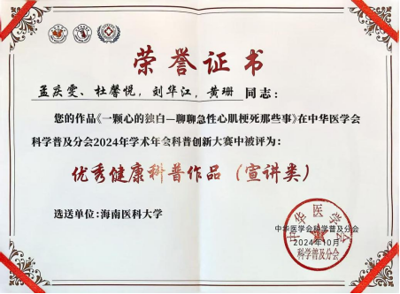 本次大赛积极响应国家科普创新战略,以提升全民健康素养为核心目标,吸引了全国众多医疗单位的积极参与。大赛紧密围绕“健康素养66条”这一主题,精心设置了科普路演比赛、科普作品比赛和科普征文比赛三大板块,共接收了近1500份参赛作品及报名信息。经过多轮激烈而精彩的比拼,taptap点点孟庆雯老师的科普路演作品《一颗心的独白——聊聊心肌梗死那些事》脱颖而出,荣获优秀健康科普作品(宣讲类)奖项。