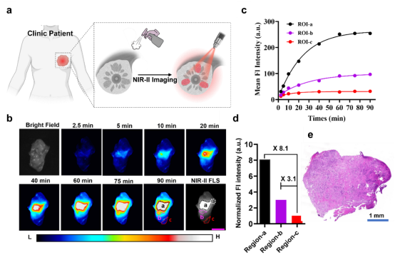探针能以超过10倍的成像对比度区分肿瘤与正常组织; 通过特异性的近红外二区荧光引导,切除后的肿瘤残留的阴性边界直径约为0.25 mm.
