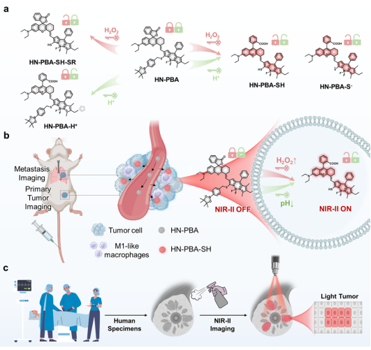 为此本文作者构建了一种可被肿瘤相关H2O2和微酸性环境协同激活的近红外二区影像探针HN-PBA,并用于高对比度肿瘤成像及荧光引导手术导航的研究。