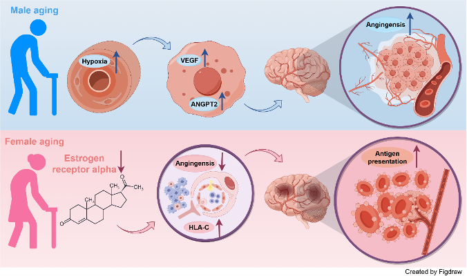随着深度老龄化时代来临,阿尔茨海默症(AD)等衰老疾病高发已成为世界尤其中国面临的重大社会以及科学问题。流行病学数据充分表明女性更易高发AD,然而既往研究中关注的男女性激素差异等原因无法完全解释这种性别偏倚性,提示AD的致病机制远未明确。本研究另辟蹊径,受AD早期事件血脑屏障损伤启发,聚焦于同样具有男女差异并可能导致血脑屏障损伤的血管衰老过程。通过整合分析1,124例不同性别的AD及对照的脑血管单细胞转录组数据和传统bulk转录组数据,并结合AD小鼠模型功能实验,揭示了男性在正常血管衰老和AD疾病过程中均能够持续激活低氧应激反应及下游血管生成通路,而女性AD的血管系统则表现出免疫应答反应特异性增强。研究人员进一步发现女性衰老中血管系统功能下降的原因可能是雌激素受体与低氧诱导因子互作丢失,并基于此提出靶向雌激素转录因子CREB1的精准治疗方案。本研究充分发挥单细胞高分辨率精细解析、高通量数据特征挖掘以及功能实验验证的交互式优势,首次提出男女血管衰老差异可能是导致AD发病性别偏倚性的关键原因,对AD早期发病机制及潜在药物研发奠定理论基础,有望助力国家积极应对人口老龄化战略。