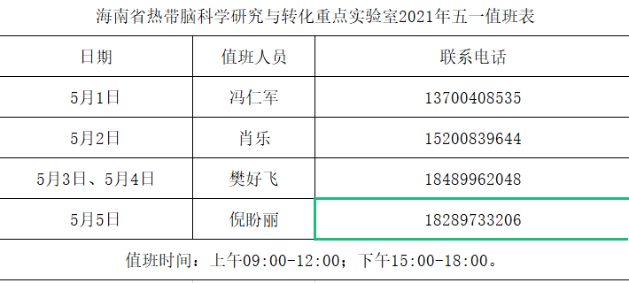 海南省热带脑科学研究与转化重点实验室2021年五一节日人员值班表