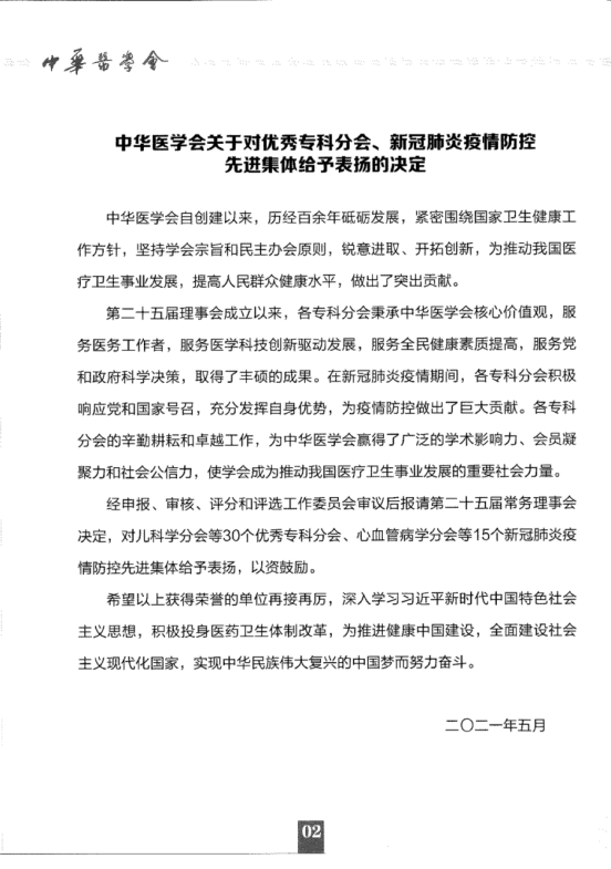 基于在新冠肺炎疫情期间,中华医学会各专科分会积极响应党和国家号召,充分发挥自身优势,为疫情防控做出了巨大贡献。经申报、审核、评分和评选工作委员会审议后报请第二十五届常务理事会 决定,评选出30个优秀专科分会、15个新冠肺炎疫情防控先进集体,给予表扬,以资鼓励。中华医学会急诊医学分会包揽“优秀专科分会”、“新冠疫情防控先进集体”两大荣誉。感谢各级领导和社会各界对中华医学会急诊医学分会辛勤付出和卓越工作的认可,这两项殊荣也是中华医学会急诊医学分会学术影响力、会员凝聚力和社会公信力最佳证明。