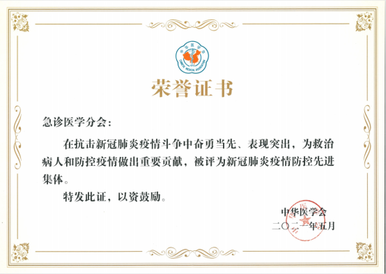 是荣誉,更是动力。在中国共产党成立100周年的新节点,中华医学会急诊医学分会将携手各省、直辖市、自治区各级急诊医学分会和广大急诊医务工作者,牢记使命,不忘初心,继承发扬急诊急救“火线军”的优良传统,弘扬伟大抗疫精神,与健康中国行动步调一致、同频共振,支持参与医改,落实对各级医疗卫生机构急诊科的功能定位、学科建设、人才培养,加强新技术、新材料、新药物研发,强化急诊医疗行业从业人员自律,为实现人人享有均质平等的急诊医疗服务,不断提升医疗水平和质量。